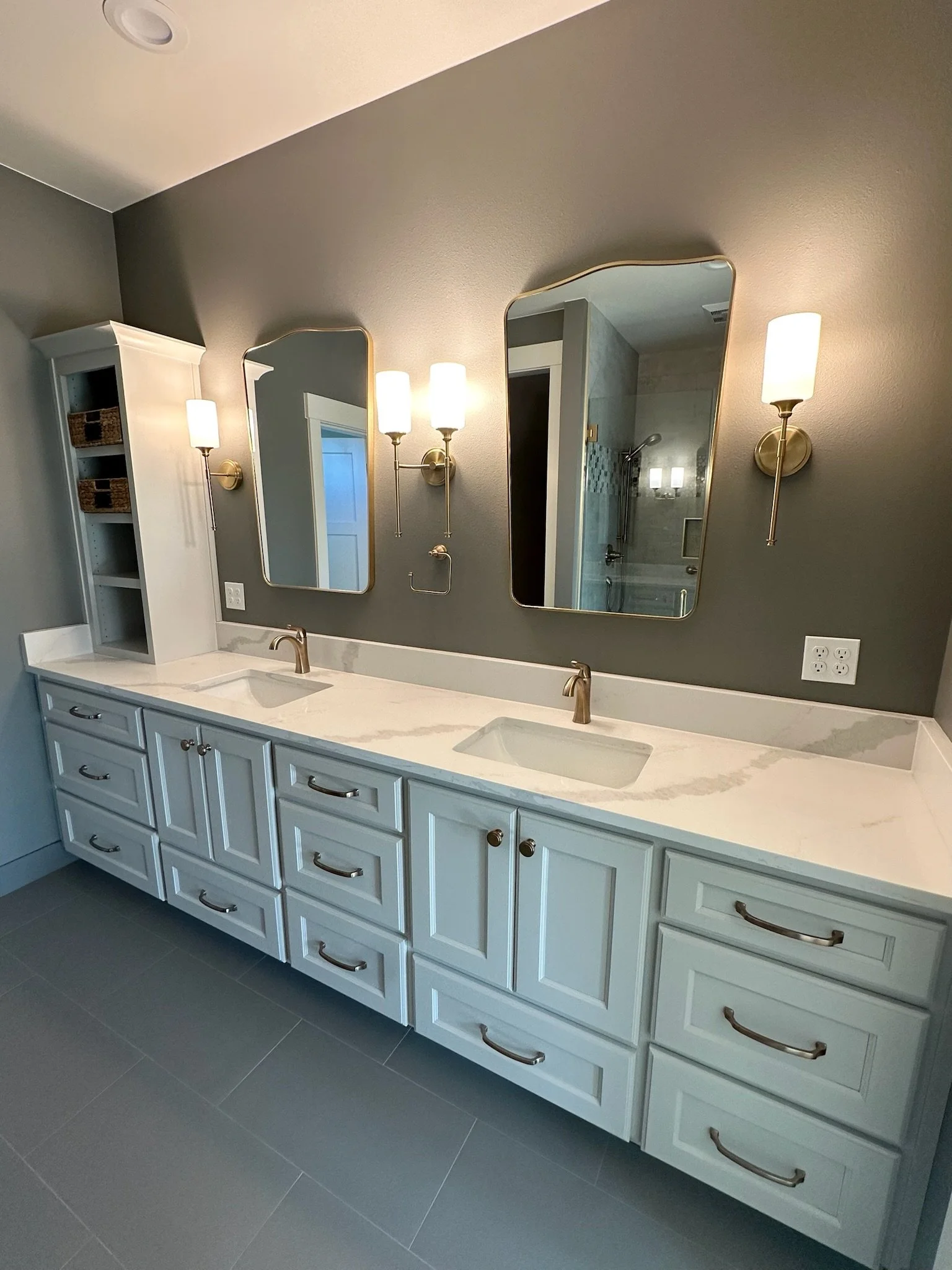 Don & Denise provided Nate with finished Building Plans and told him to go to work. Nate got involved with Sitework on their 1.13-acre, Mt Rainier View LOT. Nate worked with his Geotechnical Engineer for soil typing, infiltration testing and water table monitoring; and Civil Engineer for Storm Drainage Designs. He demolished the old existing home on the property and then moved to Site Grading & Retaining Wall construction, preparing for the Foundation and Home construction.  The Client had already designed and received Approval of the Septic System, which Nate had installed…. The Home is an Elegant 1-1/2 STORY Home with over 3500 square feet which includes upstairs living for Guests with a full bath. The Elegance is framed with beautiful white craftsmanship millwork trims and moldings and a lavish abundance of Cabinets through out the Home. Special imported European Oiled Hardwoods provides the runway to a Kitchen every Chef would love to have and to Open Living Areas that can accommodate huge Parties and Gathering Areas.